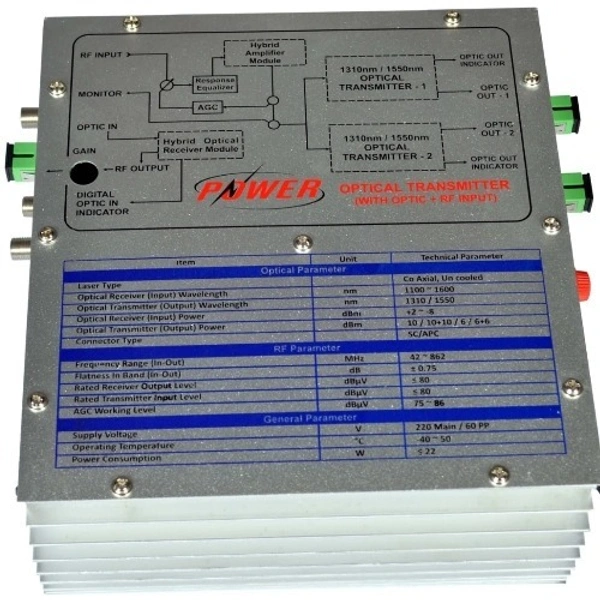 Optical Transmitter with Dual force supply and Dual optic laser yield. This Transmitter depends on DFB (circulation input) Technology for transmission of optic sign at 1310nm and (optional)1550nm for multi simple and advanced channels CATV transmission. The DFB innovation with RF PDC (pre-contortion circuit) have been consolidate top accomplish fantastic C/N execution for digital TV organize. This optivision transmitter have AGC and MGC both control for simple to deal with RF input signal. This transmitter is built with SMD innovation to give high caliber empower it to meet or surpass its exhibition.